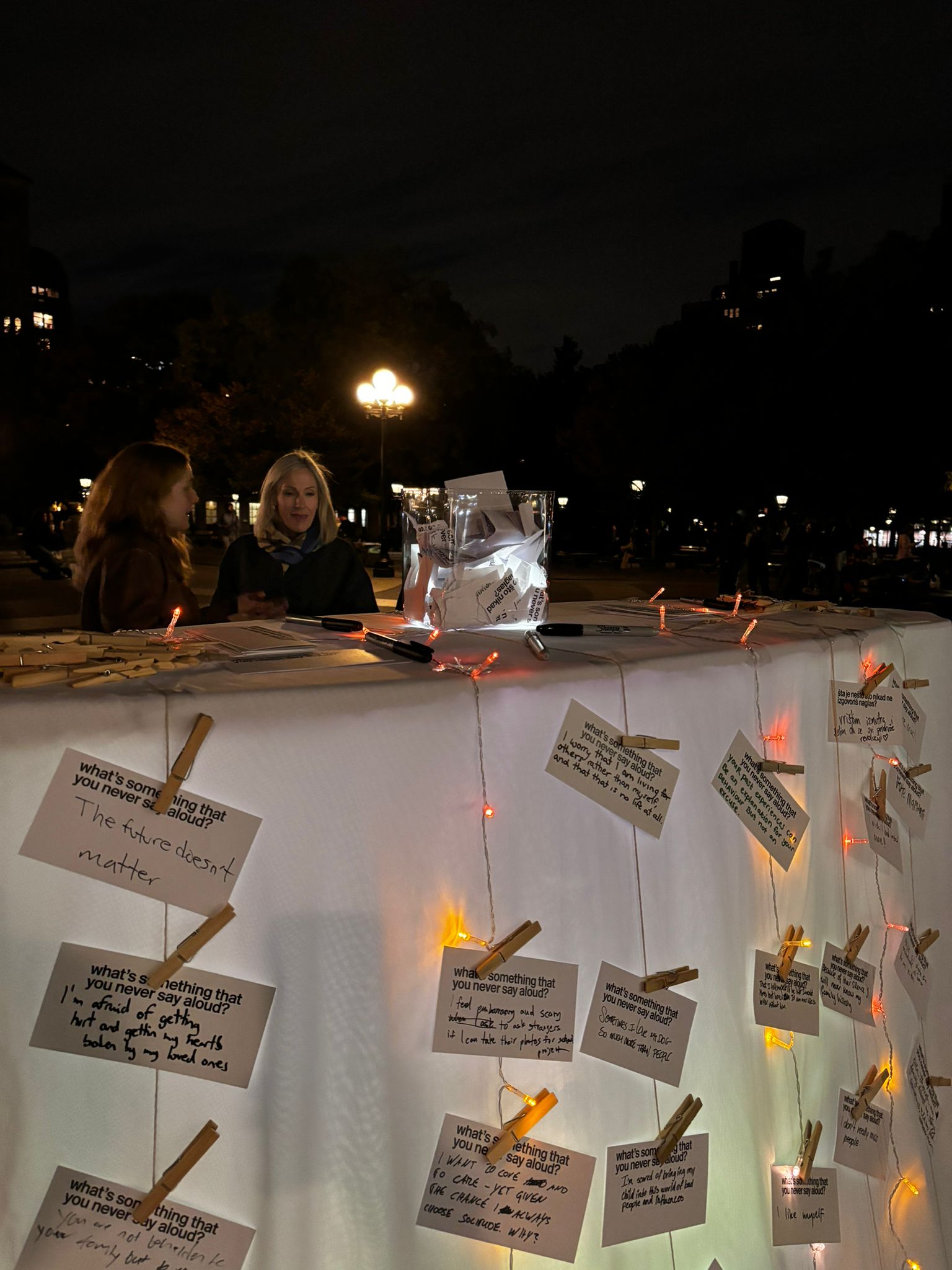 the work shifted. instead of asking people to come to us, we went to where public life was already happening. washington square park became the setting. a simple table covered in fabric and a growing wall of cards invited passersby to record an unsaid truth.